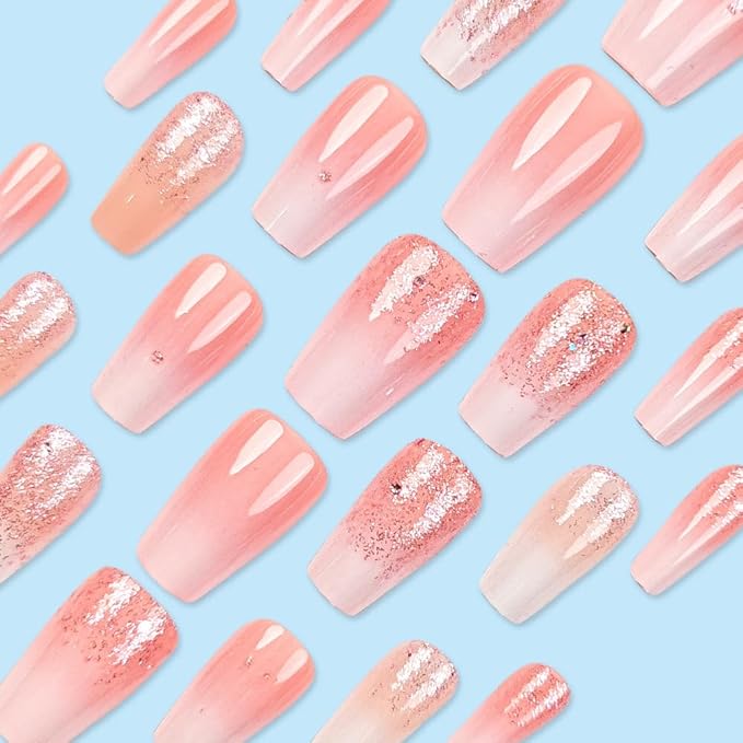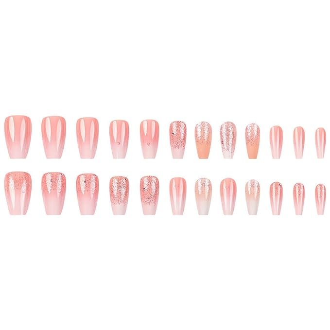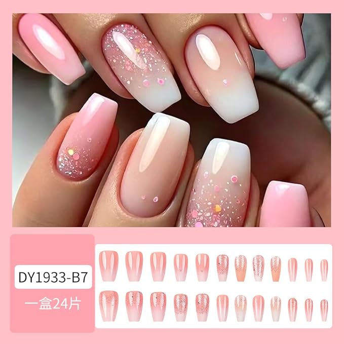 Coffin Square Press on Nails Gradient Pink White Fake Nails French Acrylic Full Cover False Nails with Glitter Designs Glossy Glue on Nails Short Stick on Nails Artificial Nails for Women Girls 24PCS