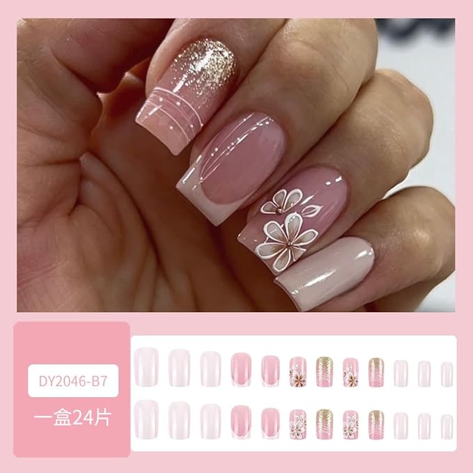 White French Tip Press on Nails Medium Square Fake Nails Glossy Pink Acrylic Full Cover Flower Glue on Nails with Glitter Designs French False Nails Stick on Nails Artificial Nails for Women Girls