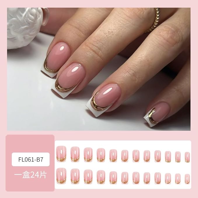 French Tip Press on Nails Square Fake Nails Pink 3D Gold Texture Acrylic Nails Medium False Nails with Designs White French Nails Stick on Nails for Women Glue on Nails with Adhesive Tabs Nail File