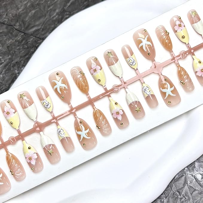 30Pcs Pink Flower Press on Nails Medium Almond Fake Nails with 3D Gold Starfish Gold Beads Shell Design White Yellow French Tip False Nails Spring Summer Floral Stick on Nails for Women Decor