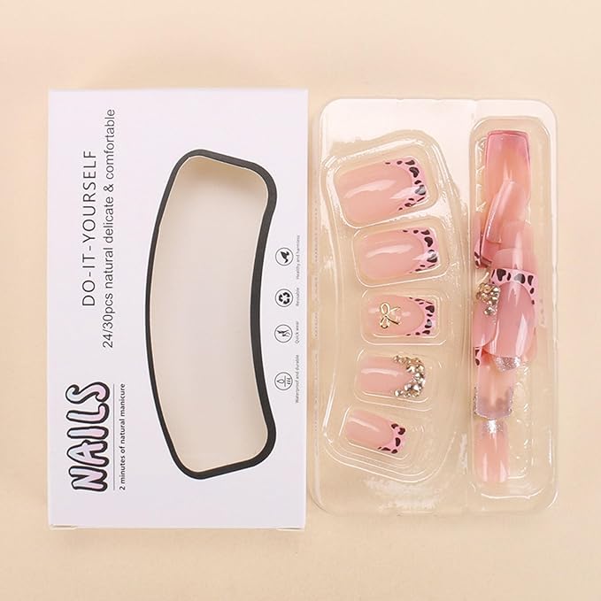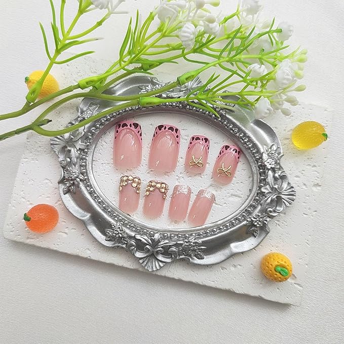 Fall Press on Nails Medium Square Fake Nails with Bow Leopard Print Rhinestones Designs Pink French Tip Nails Press ons Glitter False Nails for Women 24Pcs