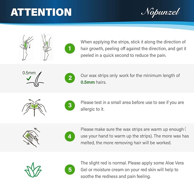- ✅Green Formula - Nopunzel Wax Strips made from Beeswax essence and jojoba seed oil, which are gentle to your skin, safe, and with no mess to use. Nopunzel Wax Strips remove unwanted hair for men and women effectively yet gently to the skin at home waxing kit.