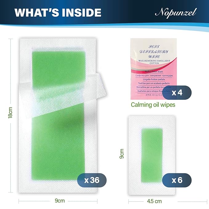 - ✅Convenient - Nopunzel waxing strips can be quickly melted by your hand temperature, and perfectly fit on your skin. No microwave or wax warmers are needed. Nopunzel wax strips provide two of the most popular sizes (9*18 and 4.5*9) for you to mix and use, to help remove your unwanted hair.