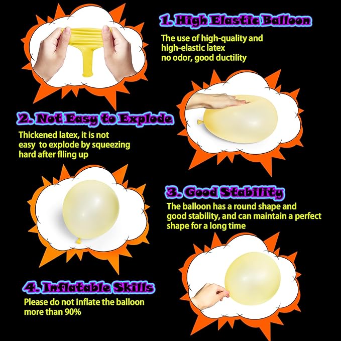 - Professional Service: Please do not inflate the UV neon balloons more than 90%, or rub against overheated and sharp objects to avoid sudden popping. Neon colored balloons will not glow in the dark without a UV black light response. Support resend for any missing or damaged parts in your package. If you have any questions, please feel free to tell us, we will give you a satisfactory solution within 24 hours.