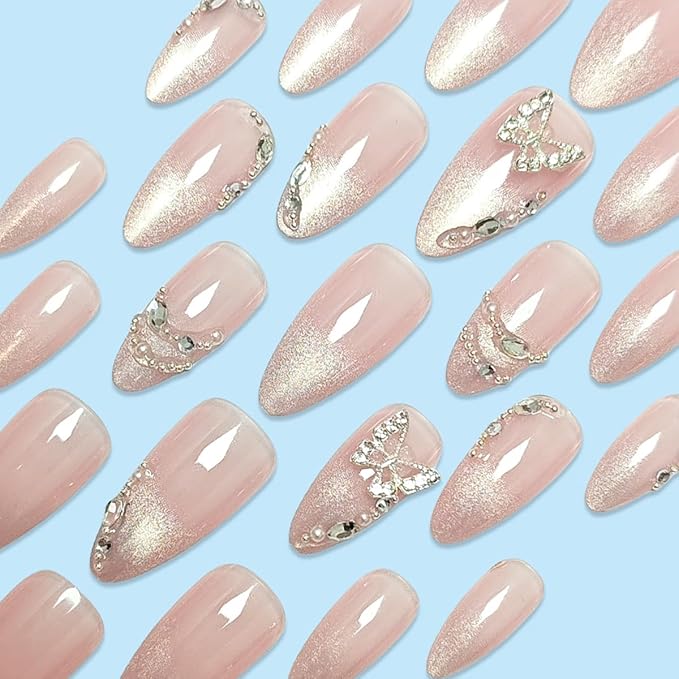 24Pcs Silver Rhinestones Press on Nails Medium Almond Fake Nails Butterfly Gems Glitter Full Cover Acrylic French Tip Glue on Nails Gradient Pink False Nails Stick on Nails for Women Nail Decorations