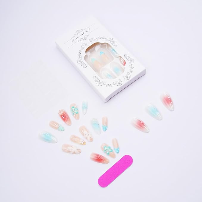 - High-quality False Nails: Made with quality materials, our set of 24 blue flower fake nails feature a trendy medium almond acrylic nails design in glossy,give 24 pcs jelly gel 1 wooden stick 1 nail file perfect for manicure decoration