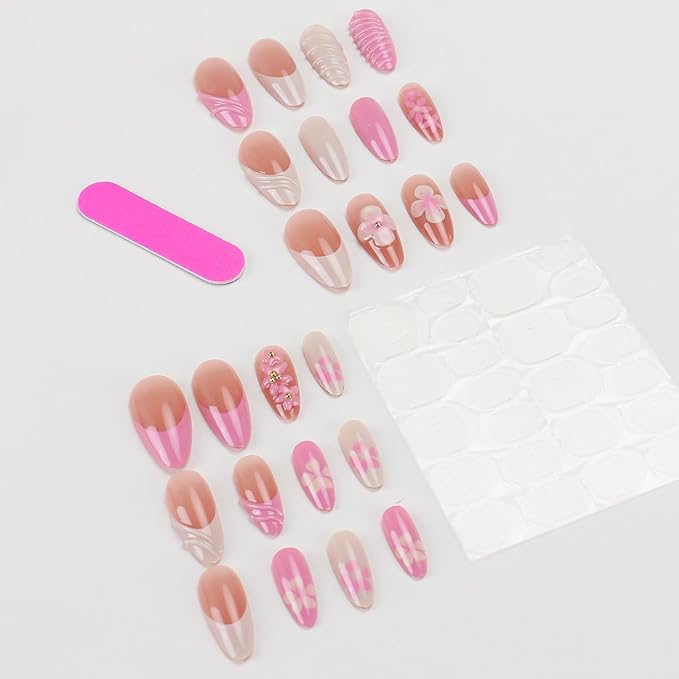 24Pcs Pink Flower Press on Nails Medium Almond French Tip Fake Nails with 3D Water Ripple Design Full Cover Artificial Glue on Nails Spring Summer False Nails Yellow Stick on Nails for Women DIY Kit