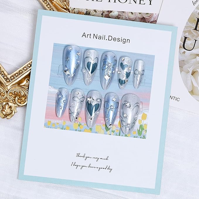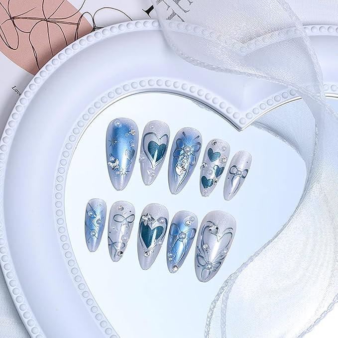 - Almond Nails Set :24Pcs Blue Bow Press on Nails with Rhinestones Design Heart Nails+1 Nail File + 24Pcs Jelly Glue Stickers+1 Wooden Stick.Durability of jelly glue is not as good as liquid glue, but it makes almond acrylic nails reusable