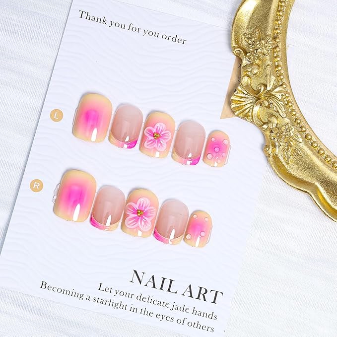 - Easy to Apply:Full cover short square fake nails with design flower nails set are instead of spend lots time, you can change you nails style in 15 min .Clean your nails before use and avoid using water for the first hour after wearing them , summer glue on nails will stay longer