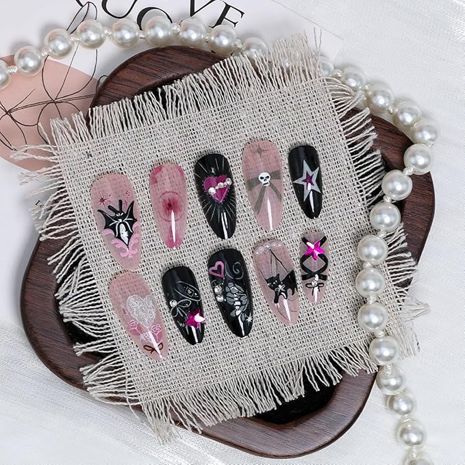 24Pcs Halloween Press on Nails Almond Medium Fake Nails Y2k Bat Cat Heart Star Rhinestone Design Gothic Acrylic Nails Black Pink Glue on Nails Bow False Nails Halloween Artificial Nails for Women