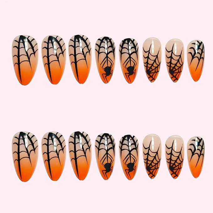 24Pcs Halloween Press on Nails Medium Almond Fake Nails with Spider Design Halloween Glue on Nails Gradient Orange Acrylic Nails Spider Web Full Cover Goth False Nails for Women Manicure Decoration