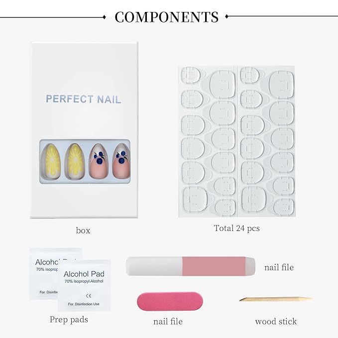 - Unique 3D Fruit Design – Featuring charming blueberries and a lemon slice in raised 3D texture, these press-on nails bring a fun and fresh summer vibe to your fingertips.