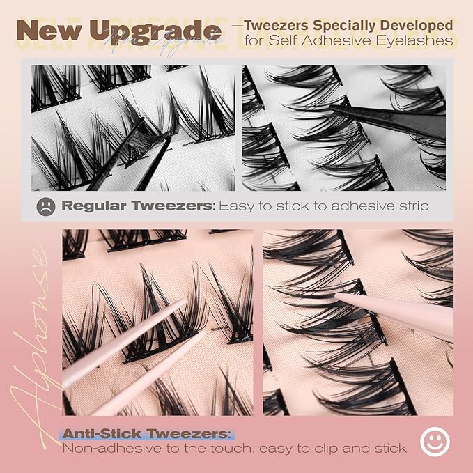 - 2.【Anti-Stick Tweezers Specially for Self Adhesive Eyelashes】Unlike regular tweezers, non-stick tweezers won't stick to eyelash clusters tape and cause glue entangled. Plus, anti-stick tweezers angled design and micro-grip tips grip the self-adhesive lash band tight, letting you apply press-on lashes faster, neater and totally.