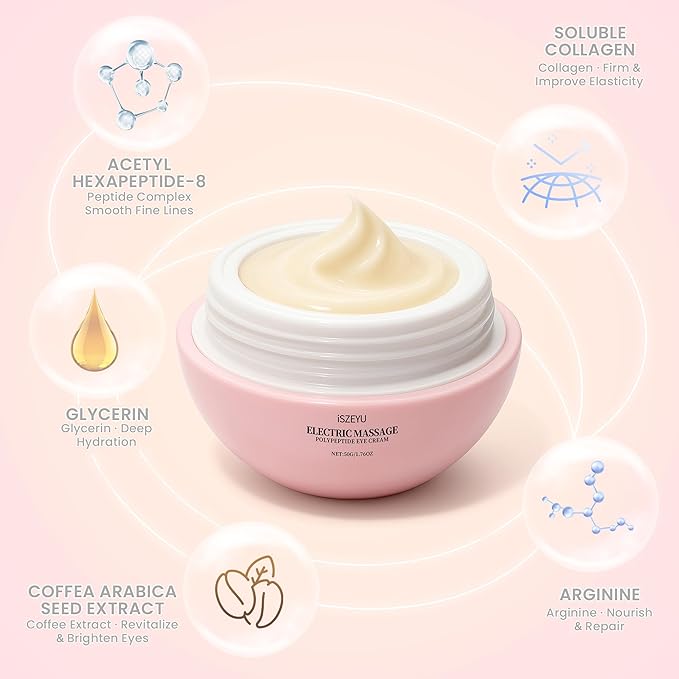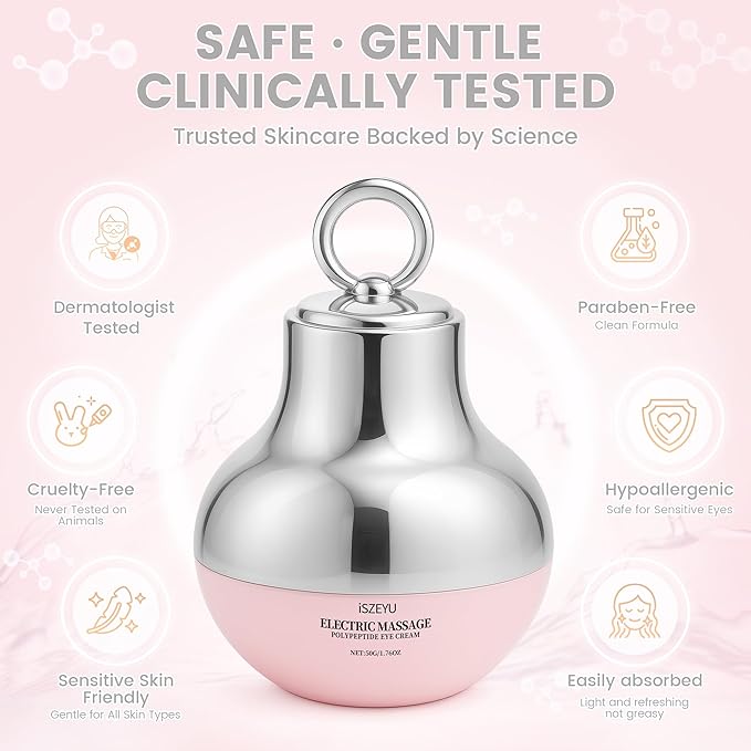 - INNOVATIVE MASSAGE: Features electric massage eye cream with red light therapy, technology massager with gentle vibration therapy around the puffy eye area, iSZEYU electric massage polypeptide eye cream helping reduce fatigue and enhance product absorption. Firming neck and eye care set