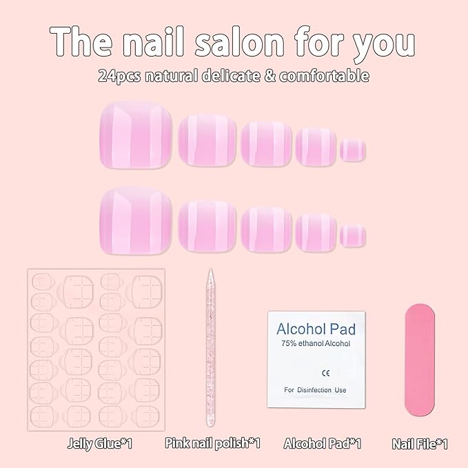 - Package Contents:24pcs pink gradient press on toe nails +1 nail file + 24pcs jelly glue stickers+1 alcohol cotton+1 crystal stick.No matter the size or width of your nails, you can choose the most suitable false nails for yourself