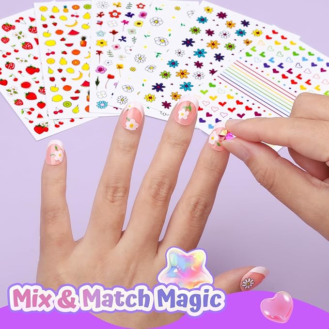 - Fun Stickers&3D Gems for Creative Play: Spark creativity with nail stickers for kids featuring 6 sheets of adorable decors: 3 floral patterns, 2 fruit patterns, and 1 heart pattern. 2 sheets special rhinestone stickers add fantasy dimension with mermaid scales and geometric shapes that catch the light beautifully, ideal for both nail art and face makeup, allowing girls to decorate each manicure differently - Mix and match flower, fruity, rhinestone nail stickers to create unique nail art.