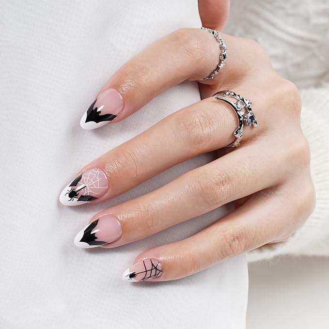Halloween Press on Nails - French Tip Press on Nail with Blakc Web Bat, Short Almond Fake Nails Reusable Nails Press ons, 32 Pieces in 16 Sizes False Nails Kit with Glue, Grave Whisper