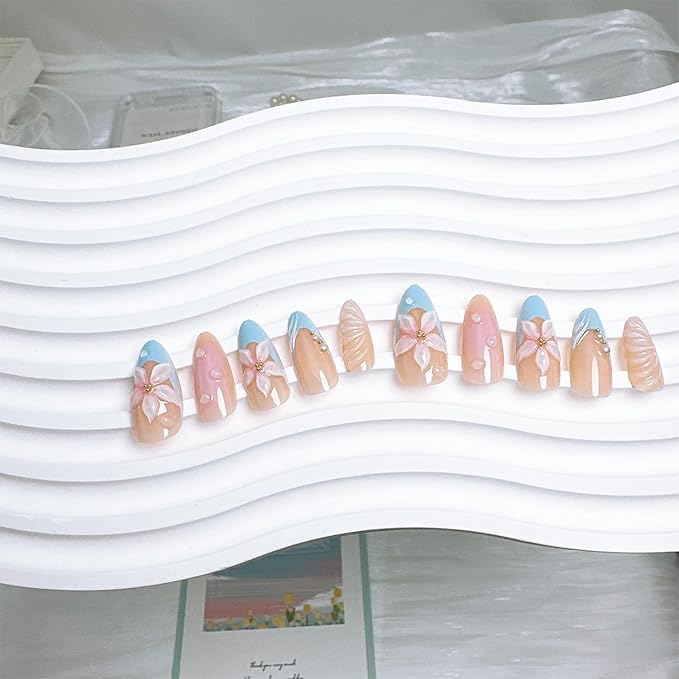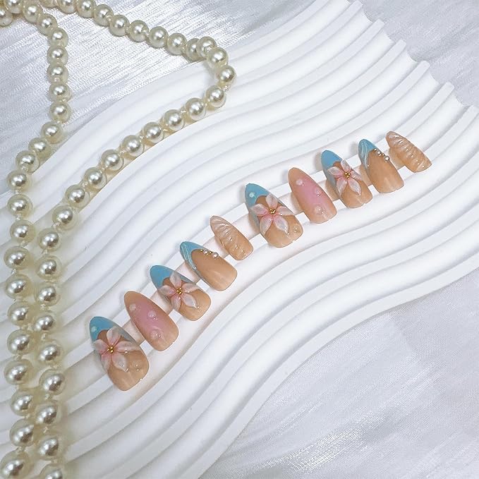24pcs Blue French Tip Press on Nails Short Almond Fake Nails with 3D Flower Pearl Designs Summer False Nails Floral Acrylic Nails Kit Stick on Nails Full Cover Glue on Nails for Women Nail Decoration