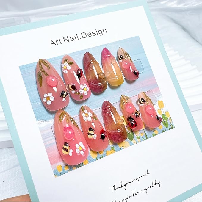 24pcs Summer Press on Nails Medium Almond Fake Nails with Insect Flower Acrylic Nails Designs Bee Glue on Nails Cute Floral False Nails Kit Full Cover Stick on Nails for Women Nail Decoration