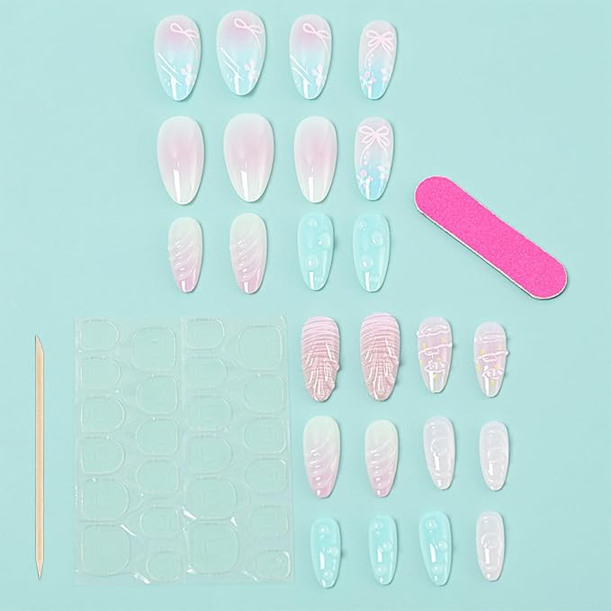 24pcs Cute Press on Nails Medium Almond Fake Nails with 3D Designs Summer False Nails Kit Flower Glue on Nails Bow Acrylic Nails Gradient Full Cover Stick on Nails for Women Beach Nail Decoration