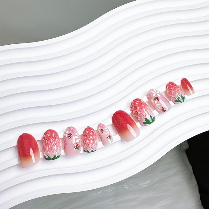 24pcs Flower Press on Nails Short Almond Fake Nails with 3D Strawberry Designs Cute Summer Fruit False Nails Kit Floral Stick on Nails Full Cover Acrylic Nails Glue on Nails for Women