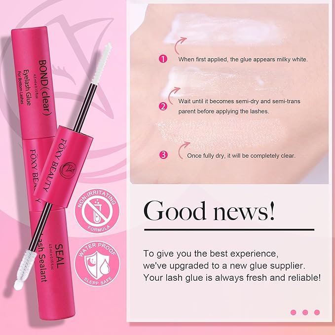 - 【Updated Version Bond & Seal】To give you the best experience, we've upgraded to a new glue supplier. Your lash glue is always fresh and reliable! Updated version bond & seal persistence increase 3-7 days, giving you natural and gorgeous lashes in no time. 2 in-1 adhesive seal, waterproof and sweat-proof effect, no caking, no irritation, whether you are sweating during exercise, swimming or rainy days, you don’t have to worry about embarrassment, show confident beauty.Non-clumping, and non-irritating. our eyelash remover easy removal of lash extension wisps as well as excess bond and seal.