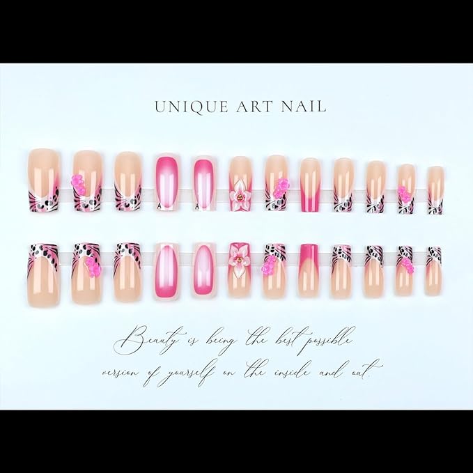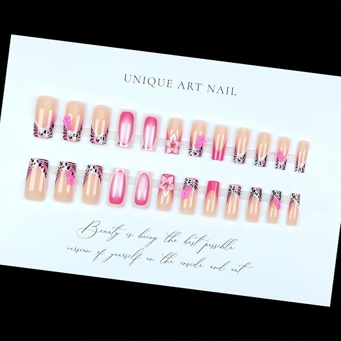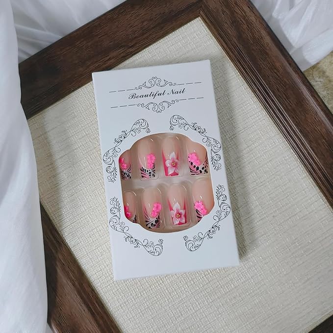 - Flower Leopard Nail Art: Elegant french false nails, featuring stunning 3D floral and leopard print pink design, creating a fashionable flowers nail art style