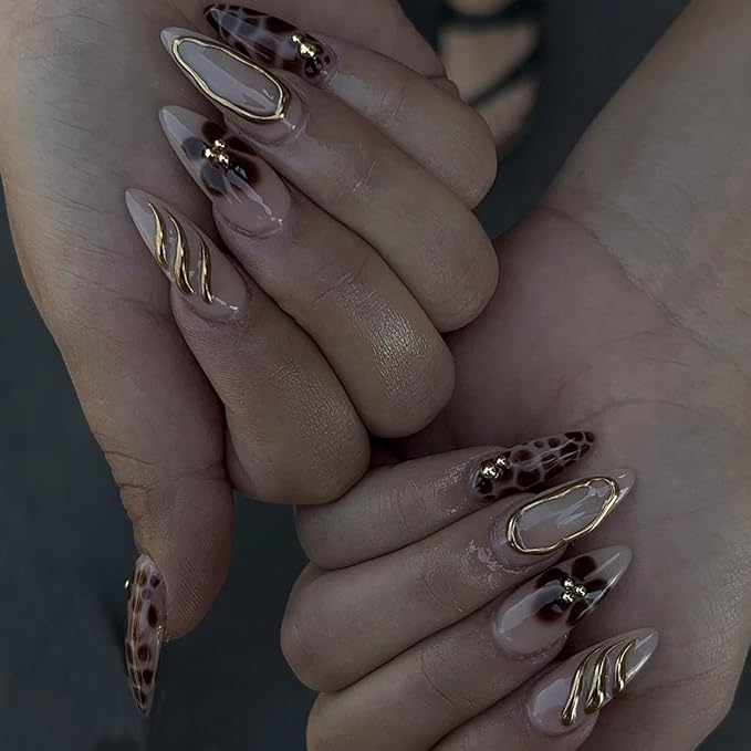 - Leopard Print Nail Designs: brown flowers leopard print nails tip design, gilding 3D frame nail art decorations, medium almond shaped nails, full cover glue on nails are very suitable for women diy fashion nail styles