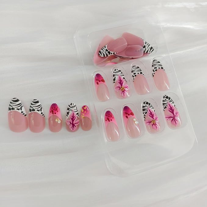 24Pcs French Tip Press on Nails Medium Almond Fake Nails 3D Flower Cute Leopard Nail Art Design Acrylic False Nails with Rhinestones Full Cover Pink Embossed Flowers Stick on Nails for Women