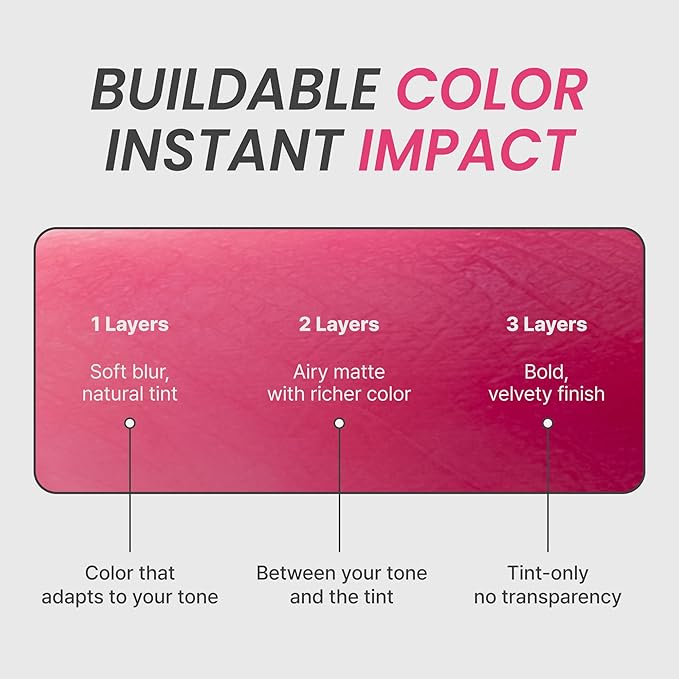 - Long-Lasting Velvet Matte: Buildable tint with a soft-blur finish, enriched with Peptide Complex, Panthenol, and Aloe Vera to soothe and support lip health.