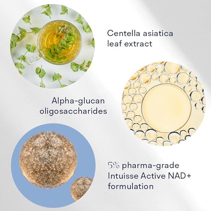 - CLEAN, HIGH-PERFORMACE FORMULA – Our daily NAD+ formula features 5% pharma-grade Active NAD+, centella asiatica leaf extract, and alpha-glucan oligosaccharides. This vegan, non-GMO formula balances the skin's microbiome, calms irritation, and restores clarity. A sophisticated alternative to harsh cleansers and makeup removers.