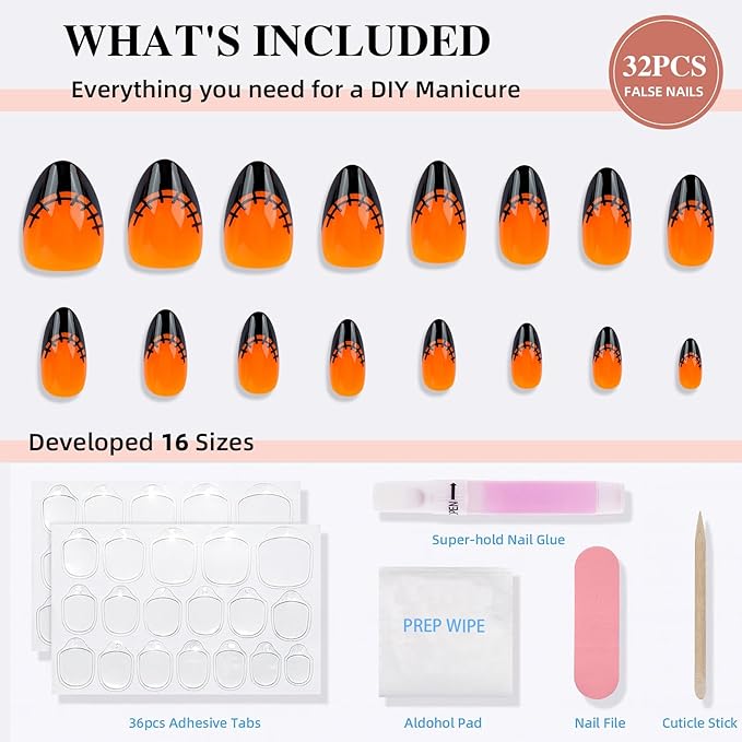 - Complete Professional Nail Kit - Includes 32 press on nails (16 sizes), nail glue, jelly adhesive tabs, a dual-sided nail file, a cuticle stick, and prep pads. Everything you need is included, no extra purchases required! Just glue, press, and go! Even beginners get flawless salon-quality results at home