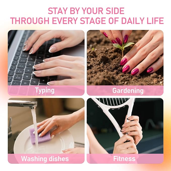 - High-Quality Design:The surface of BelleOynx fake nail tips is crafted with innovative technology,effortlessly with standing daily activities.Whether you’re typing at work, gardening,or playing with pets,these short almond press on nails stay in place and maintain a flawless look all day.
