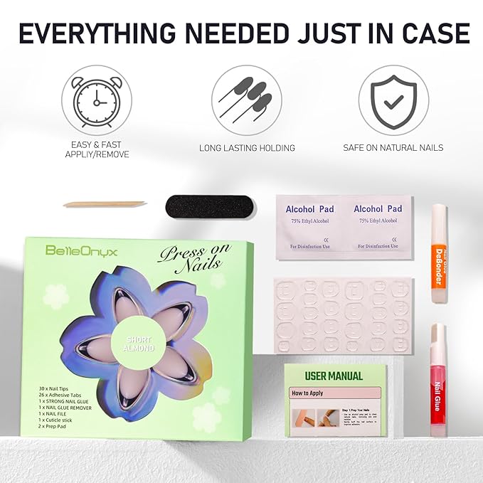 - Beauty is at Your Fingertips:Our Pre-shaped almond nail tips let you achieve salon-worthy nails in 5 minutes—perfect for 9-to-5 or those with busy schedules.BelleOynx short almond acrylic press on nails offers a natural, wearable appearance that makes you stand out in a crowd.