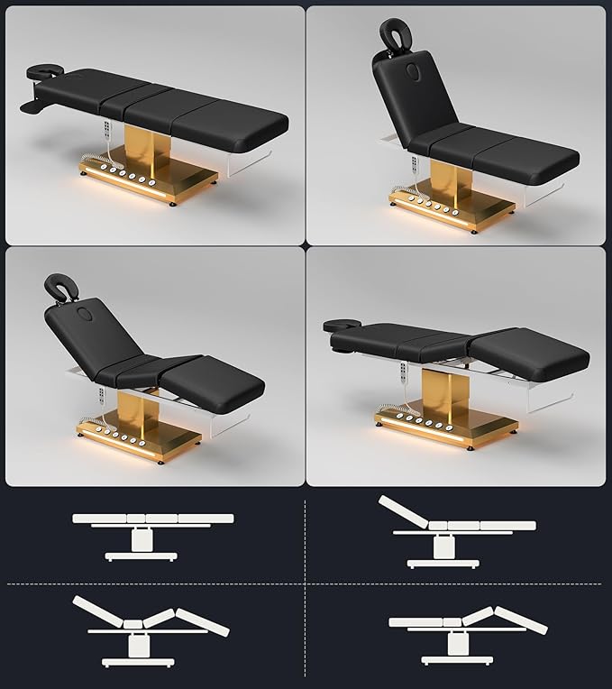 - Stable Base Design: Unlike traditional X-frame bases, this bed features a uniquely designed, weighted base that guarantees exceptional stability, preventing sliding or tipping. The motors are neatly concealed within the base for a sleek and clean look. The addition of an LED light strip at the bottom turns this beauty bed into a striking visual element in your salon, creating an inviting and modern atmosphere