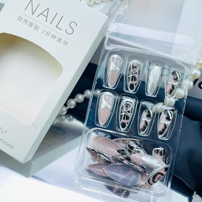 3D Silver Press on Nails Medium Almond Fake Nails with Metallic Line Designs Y2k Nails Chrome False Nails Gothic Glue on Nails Black Leopard Print Artificial Full Cover Stick on Nails for Women 24Pcs