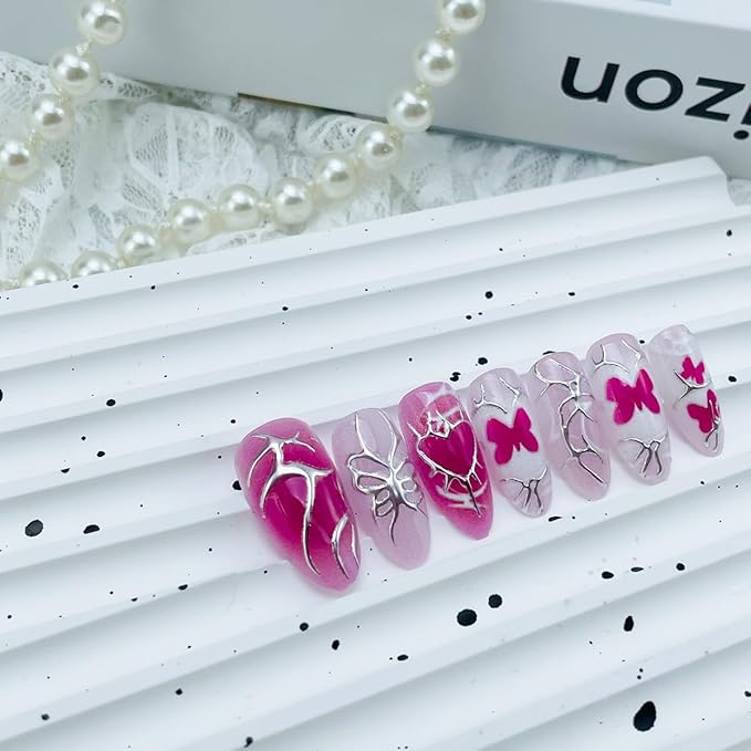 30Pcs Rose Red Press on Nails Medium Almond False Nails 3D Silver Line Designs Y2k Fake Nails Handmade Acrylic Stick on Nails Butterfly False Nails Reusable Full Cover Glue on Nails for Women Manicure