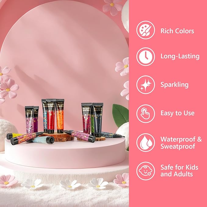 - 【Easy to Apply & Long-Lasting Waterproof】You can apply the glitter gel to your hair and body with your fingertips, it can be used directly on the skin you want to decorate, let it dry for a moment; makeup glitter gel is waterproof, will not come off due to sweating, long-lasting and shiny, it can stay all day without fading, smudging, or falling off, making your makeup more prominent under the lights