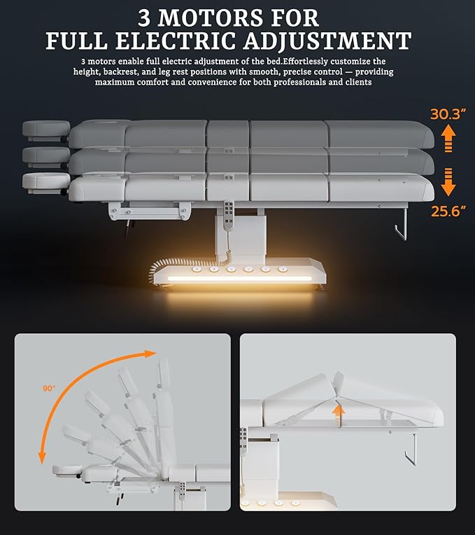 - High-Performance Silent Motors: This electric beauty bed is equipped with three powerful motors that enable smooth and precise adjustments to the bed’s height, backrest angle, and leg rest incline. The efficient motor system minimizes the risk of jamming and noise, providing a quiet, uninterrupted treatment experience. Beauty professionals can easily adjust the bed to suit different service needs, improving workflow and helping your business grow faster