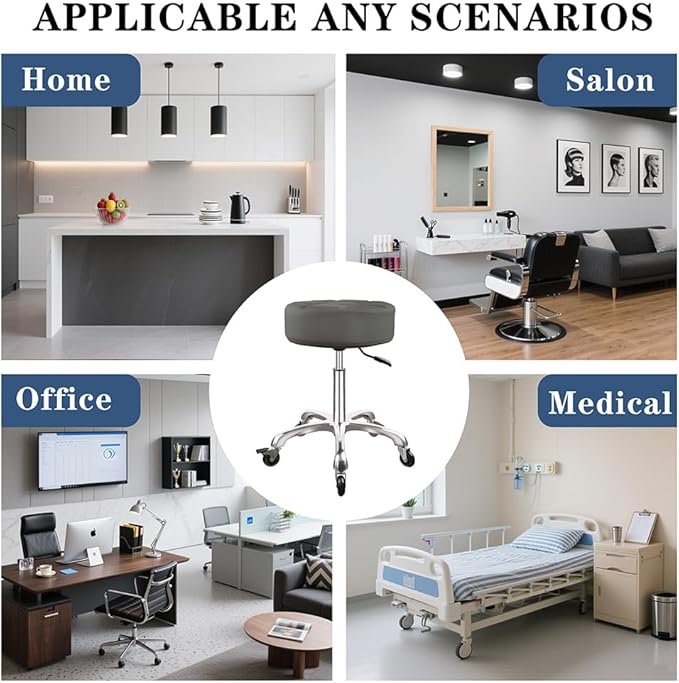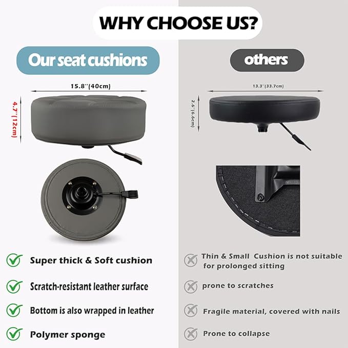 - 【Premium Extra-Thick Cushion & Luxurious Leather】Say goodbye to thinly padded stools with false comfort claims (only 2-3 inches thick). Our rolling stool features a genuinely oversized cushion (4.7 inches thick and 15.8 inches in diameter) designed for all-day comfort. These seat cushions are scratch-resistant and easy to clean.