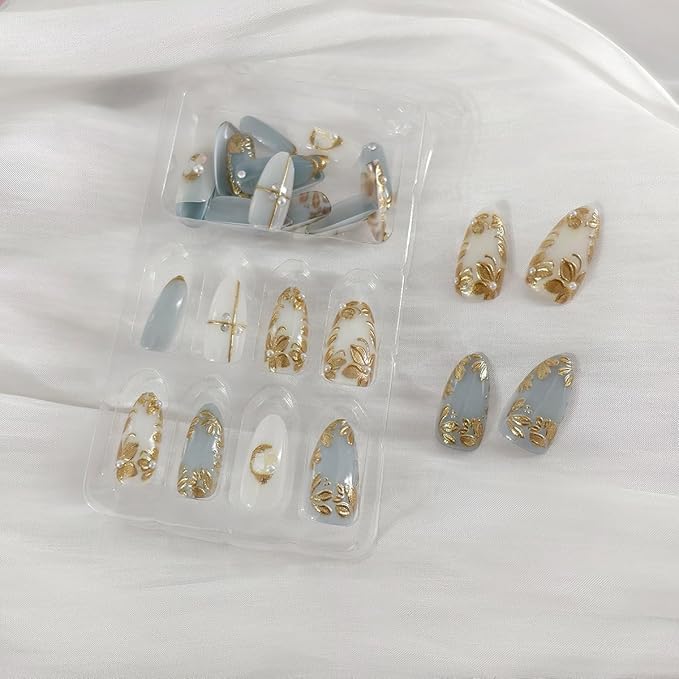30Pcs Gold Leaf Press on Nails Medium Almond Fake Nails with 3D Leaves Designs Nude Blue Glue on Nails Pearl Rhinestones Charms Metallic Leaves Nail Art Fall Acrylic Nails for Women Manicure Decor