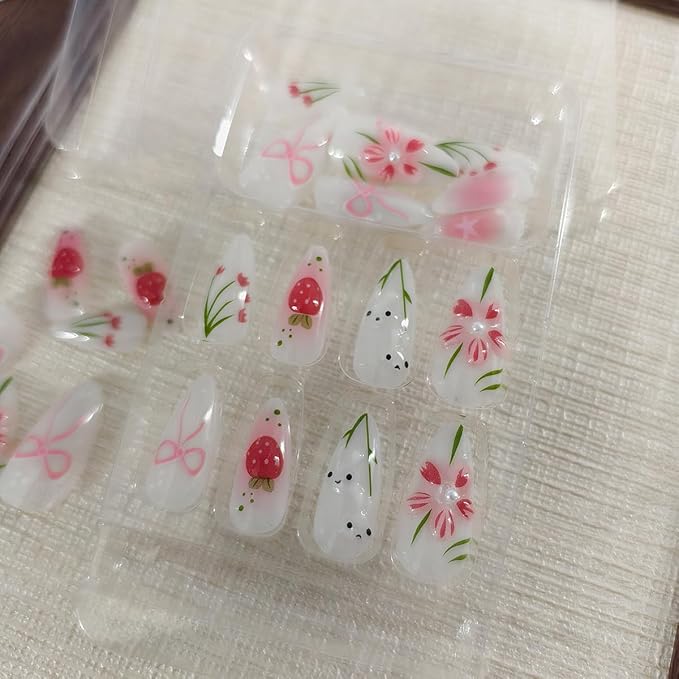 - DIY Floral Nail Art: Our almond shaped fake nails are decorated with various cute elements, including tulips, bows, rabbits, stars, strawberry etc, full cover pearl flower stick on nails are very suitable for women DIY fashion nail styles