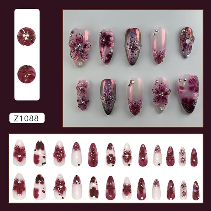 - Package: You will get 24pcs purple flower fake nails with designs, 3D pearl charms rhinestones, offering a luxurious salon like manicure at home