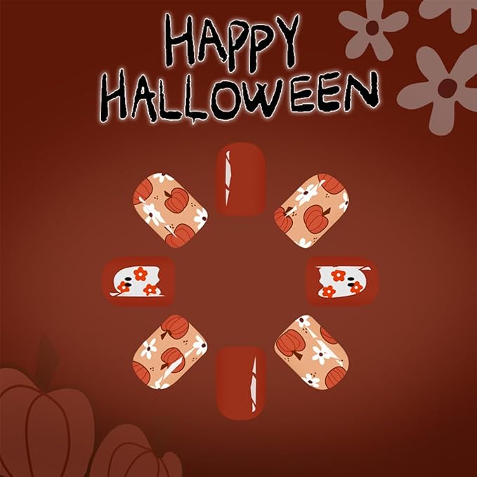 Halloween Press on Nails Short Square Fall Nails Pumpkin Ghost Fake Nails with Flower Designs Full Cover False Nails Cute Halloween Acrylic Nails for Women Manicure Decorations 24Pcs