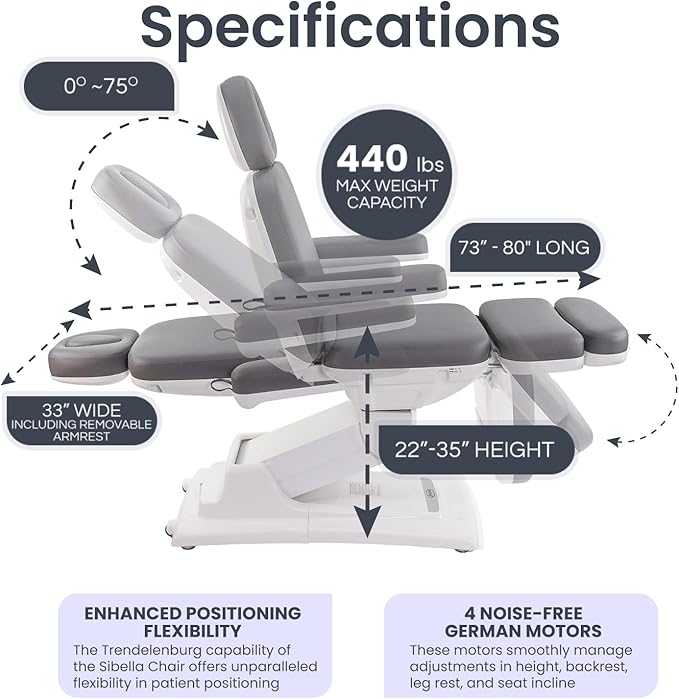 - MEDICAL SPA EXAM CHAIR AND SPA BED DIMENSIONS: 73" long with 7" footrest extension; 23" wide seat with 10" removable/reversible armrests; Adjustable height 22"-35". Features 0°-75° backrest recline and 0°-12° Trendelenburg capability for professional dermatology, podiatry, facial solutions, and comprehensive spa services. Perfect for esthetician supplies and medical office equipment.