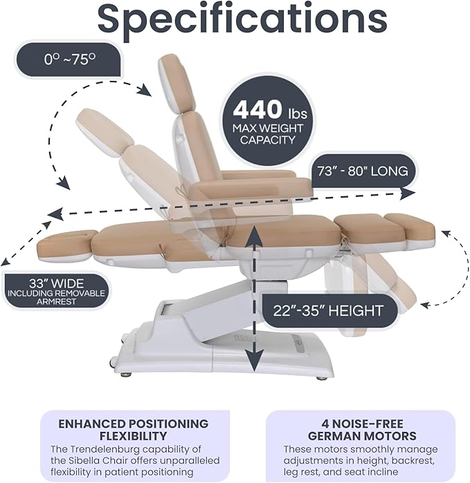 - MEDICAL SPA EXAM CHAIR AND SPA BED DIMENSIONS: 73" long with 7" footrest extension; 23" wide seat with 10" removable/reversible armrests; Adjustable height 22"-35". Features 0°-75° backrest recline and 0°-12° Trendelenburg capability for professional dermatology, podiatry, facial solutions, and comprehensive spa services. Perfect for esthetician supplies and medical office equipment.