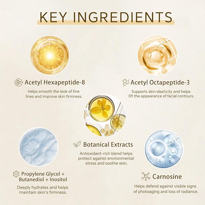 - 【Directions For Use】After cleansing and toning, evenly apply an appropriate amount of this firming peptide serum for face and gently massage until fully absorbed. For best results, use morning and evening. During the day, follow with sunscreen. This anti-aging face serum layers beautifully under moisturizer or makeup.