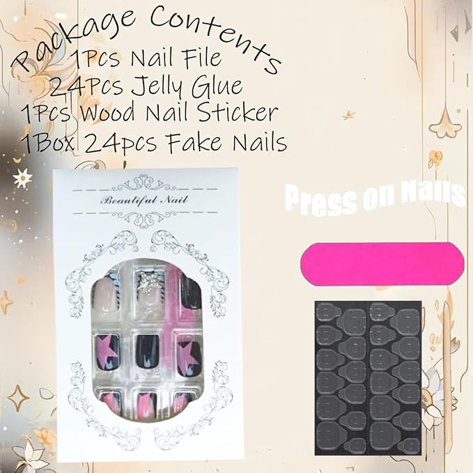 - Package About : You will receive 24pcs short press on nails for women, 1 mini nail file, 1 small wooden stick, and 1 pieces nail glue stickers. Jelly glue is not as durable as liquid glue, but it makes short oval fake nails reusable. Please use suitable glue according to different scenes.