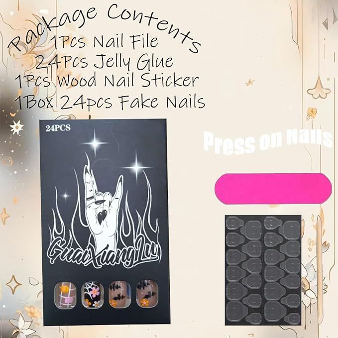 - Complete Manicure Kit: Includes 24 short press on nails halloween in various sizes, 1 jelly glue, 1 mini nail file, 1 alcohol pad,everything you need for an effortless, DIY manicure.