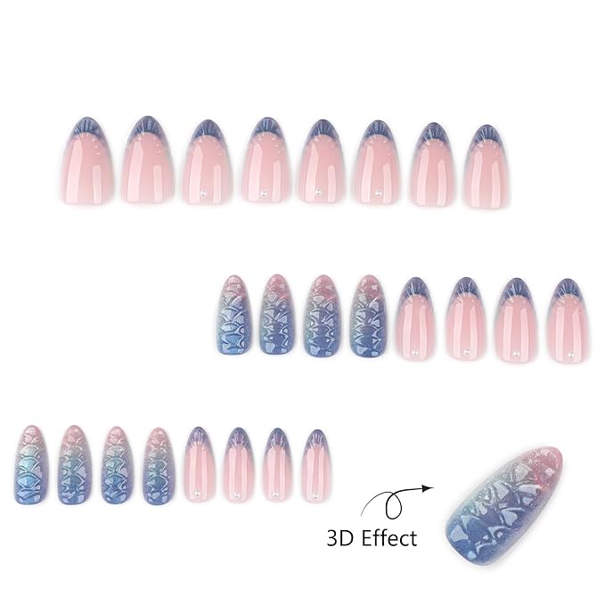 Mivoa Almond Press On Nails Medium, 24PCS Iridescent 3D Mermaid Scale Acrylic Fake Nails with Glue Kit, Gradient Pink Purple Stick On Nails for Women, Reusable Glossy False Nails for Party, Wedding